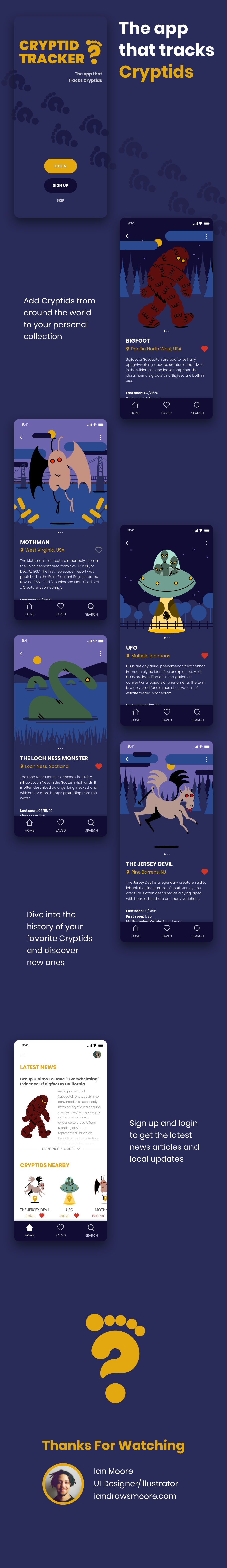 Mock UI/UX design for Cryptid Tracking app